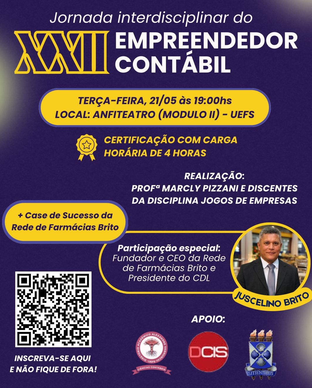 No dia 21/05/2024 (terça-feira), às 19:00h, ocorrerá, no Anfiteatro do Módulo 2 da Universidade Estadual de Feira de Santana (Uefs), a XXII Jornada Interdisciplinar do Empreendedor Contábil. O evento é organizado pela professora Ms. Marcly Pizzani e os discentes da disciplina Jogos de Empresas, do Curso de Ciências Contábeis. O evento conta com apoio do Departamento de Ciências Sociais Aplicadas (DCIS), Colegiado de Ciências Contábeis e Diretório Acadêmico.