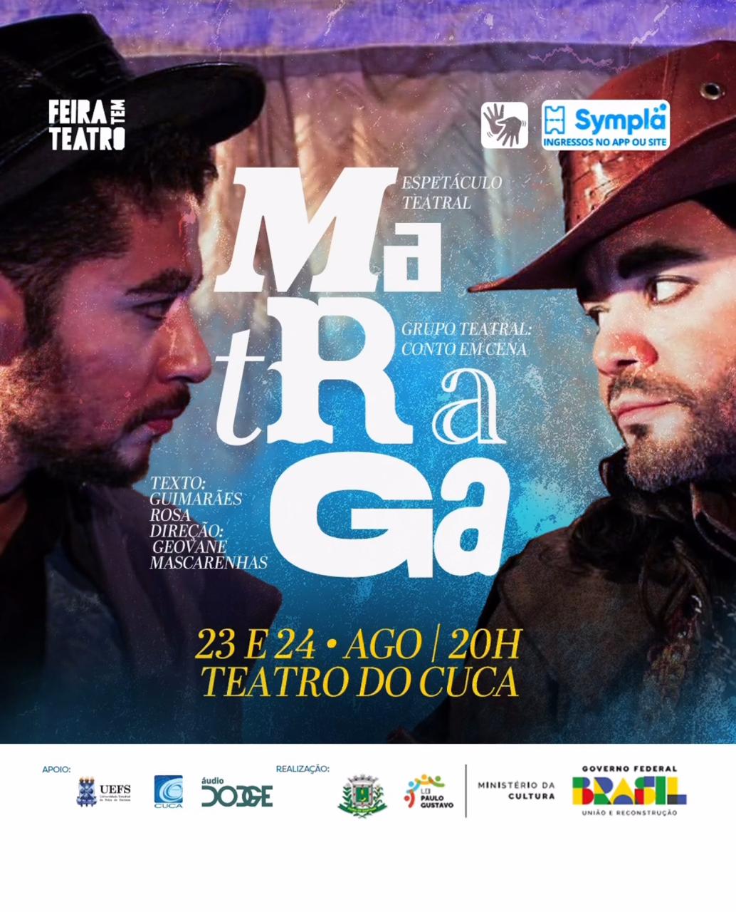 O Teatro Universitário do Centro Universitário de Cultura e Arte da UEFS receberá a peça “Matraga” do Grupo Conto em Cena nos dias 23 e 24 de agosto de 2024. O espetáculo será no Teatro Universitário do CUCA, às 20h. Os ingressos podem ser adquiridos no Sympla ou na bilheteria no dia do evento (de acordo com a disponibilidade).
